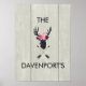 Um poster personalizado com seu nome de família ou outro texto com uma cabeça de cervo preto feita com linhas geométricas e vestindo uma coroa floral rosa. Design russa e de tendências. O fundo é uma imagem digital de tábuas de madeira de cor bege macio.