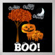 Família de Abóbora Bonita de pé por uma árvore com as Decorações de Poster do Orange Autumn Leaves para o Halloween ou Harvest Party. Perfeito para a festa de Halloween da igreja. Lua branca e nuvens com uma família de Cabeça de Abóbora de Halloween, sorridente, com um BOO Amigo! Com Olhos Engraçados em Cima de Cada Letra Grande!
