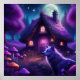 Cabina Surreal Na Floresta Com Lobo, cogumelos, árvores, estrelas e lua