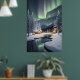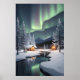 Uma cena serena de inverno desdobra-se com duas confortáveis cabanas de madeira aninhadas em meio a uma floresta de neve. O céu acima está em chamas com uma vibrante aurora boreal verde e roxa, lançando um brilho etéreo sobre a paisagem. Um rio enrolamento atravessa a neve, refletindo as luzes cintilantes da aurora. As árvores são enfeitadas com uma espessa camada de gelo, somando-se à atmosfera mágica.
