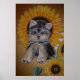 Cachorro bonito e adorável com girassóis num fundo escuro de ouro. Pegue essa linda yorkie e tenha um feliz ano de cachorro!