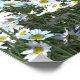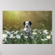 Um filhote dalmata branco e preto fica quieto num campo de margaridas brancas.