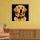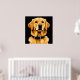 Ilustração vívida de um recuperador de ouros vestindo um colar preto contra um fundo escuro. Destaca a expressão amigável do cão e a textura distintiva do pelo, encapsular calor, lealdade e companheira.