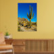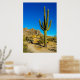 A fotografia apresenta um grande cacto saguaro multiarmado por uma trilha que leva em direção a uma montanha de pedras no deserto de Sonoran.