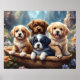 Esta poster apresenta cachorros bonitos numa cesta num prado de flores. O motivo perfeito para todos os amantes de cães e crianças! A decoração do quarto de criança adorável.