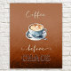 Latte ou cappuccino, revestido de arte latta em forma de coração. O fundo é uma cor marrom-quente com aspecto texturizado. O texto no poster diz "Café antes do CAOS", com "Café" A estética geral é rústica e acolhedora, sugerindo que uma xícara de café é essencial para enfrentar o caos do dia seguinte. Ele convida o espectador a pausar, saborear o momento e abraçar a tranquilidade que vem com uma xícara de java a vapor.