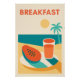 Sur un fond sable chaud, une grande feuille de monstera stylisée en vert menthe encadre une tasse de café beige clair posée sur une nappe rose corail. La tasse émet une fine volute blanche s’élevant dans un ciel bleu turquoise dégradé, évoquant la fraîcheur de l’aube sous les tropiques. Une ombre projetée nette suggère un soleil bas. Le mot CAFÉ est inscrit en lettres fines, allongées, au coin inférieur droit. L’ensemble respire la légèreté, avec des aplats simples, des formes découpées et une palette douce mais ensoleillée.