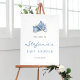 Bem-vindo a convidados para o seu evento com este sinal de boas-vindas personalizável ao chá de fraldas. Ele apresenta ilustração aquosa de um adorável chá de fraldas azul. Personalize este sinal de chá de fraldas adicionando seus detalhes. Este sinal de boas-vindas azul é perfeito para um chá de fraldas Boy.