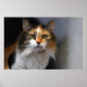 "Calico Cat de Cabelo Longo" Este lindo gato calico se apresenta com confiança, sabendo que ela é bonita. Os gatos Calico são gatos domésticos com casaco pontilhado de três cores predominantemente brancas, com manchas de duas outras cores (muitas vezes, as duas outras cores são a cor laranja e a preta). Fora da América do Norte, o padrão é normalmente chamado de tortoisinferno e branco. "Calico" refere-se a um padrão de cor no pelo, não a uma raça. Entre as raças cujos padrões permitem a coloração calica estão a Manx, American Shorthair, British Shorthair, Persian, Japonês Bobtail, Exotic Shorthair e Turco Van. Uma vez que a determinação genética de algumas casaco nos gatos está ligada ao cromossomo X, os calicídios são quase sempre fêmeas. O macho raro é normalmente estéril. Acredita-se que Calicos traga boa sorte no folclore de muitas culturas. Nos Estados Unidos, são por vezes chamados de gatos-dinheiro. A estatueta japonesa Maneki Neko é quase sempre um gato calico. Um gato calico também é o gato estadual de Maryland.
