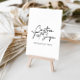 Este sinal de caligrafia de texto personalizado moderno e elegante é perfeito para um casamento rústico ou chá de noiva. O design simples e elegante apresenta tipografia de roteiro clássico e sofisticado em preto e branco.