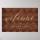 Sinal de casamento mínimo e elegante para ser exibido como um belo sinal de saudação de convidado. O sinal de boas-vindas design apresenta "Bem-vindo" em uma tipografia de caligrafia moderna de faux gold script. Personalize com o nome da noiva e do noivo e a data do casamento. O falso fundo de madeira rústica adiciona uma aparência rústica ao país.