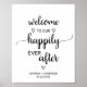 Esta simples caligrafia negra feliz para sempre após a placa é perfeita para um casamento rústico ou moderno. A design minimalista apresenta uma elegante letra de escrita de pincel e um adorável coração feminino.