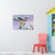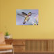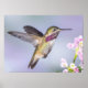 Poster cor-de-rosa e púrpura apresentando um belo beija-flor-chata voando sobre flores de lantana amarelas e cor-de-rosa, mostrando suas asas completamente estendidas no dorso e suas iridescentes penas magenta de garganta. Bonita e única decoração de parede para beija-flor, jardim e amantes da natureza. Diversão: este beija-flor é o menor pássaro da América do Norte e é nomeado a partir da musa Calliope na mitologia grega. Foto tirada em Pasadena, Califórnia.