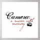 Esta renderização na moda da frase "Câmera: Um espelho com memória" em letra cursiva com uma imagem estilizada de uma câmera é perfeita para o guarda-roupa de trabalho de qualquer fotógrafo.