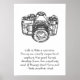 Um pôster preto e branco com uma imagem de uma câmera com uma citação esclarecedora e motivadora sobre a vida e como devemos ajustar nossa perspectiva. "A vida é como uma câmera. Foque no que é importante, capture os bons momentos, desenvolva a partir dos negativos e se as coisas não saírem como esperado – tire outra foto." O autor da citação é desconhecido. O design e a citação são ótimos para fotógrafos ou qualquer pessoa que precise de um estímulo na vida.