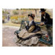 "Camille Monet (1847-1879) em um jardim (1873)" retrata a esposa de Monet, Camille, em um lugar de jardim tranquilo. Pintada em 1873, a trabalho de arte captura Camille sentada em uma bancada de madeira em meio a uma folhagem exuberante. A cena exude um senso de serenidade e intimidade, com Camille retratada num momento de contemplação silenciosa. A escova picada e o uso de luz e cor imbuem a pintura com uma qualidade etérea e macia, melhorando o humor da paz. Este retrato íntimo convida os espectadores a compartilhar a beleza e a tranquilidade de seus momentos particulares juntos no jardim.