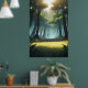 Uma pintura digital retrata uma cena serena de floresta. Árvores altas e escuras percorrem um caminho que leva ao coração da floresta, seus galhos chegando em direção a um céu brilhante e iluminado pelo sol. O ar está cheio de uma névoa feoral suave, lançando um brilho sonhador sobre a folhagem. O chão está coberto de uma relva verde-luxuosa, iluminada por uma luz quente e ouro que derramar pelas árvores.