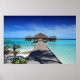 Fotografia de uma praia de areia branca das Maldivas e oceano azul lacrimogêneo com uma passagem para cabanas sobre a água.