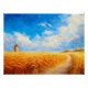 Esta pintura mostra um vasto campo de trigo ouro esticado sob um brilhante céu azul. Um estreito caminho de sujeira se estende através dos caules balançosos, conduzindo em direção a um moinho de vento velho e charmoso a distância. Nuvens brancas espertas se movem através do céu, adicionando profundidade e movimento à cena. As matizes calorosas e iluminadas pelo sol do campo contrastam lindamente com o azul nítido do céu, criando um senso de tranquilidade e charme rural. A composição evoca a beleza pacífica do campo, onde a natureza e a tradição coexistem harmoniosamente.