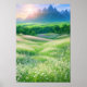 Experimente a beleza da simplicidade da natureza com este trabalho de arte digital incrível. Um campo de pastagem verde está coberto num cobertor de flores brancas, criando uma atmosfera pacífica e serena. A configuração do tranquilo é completada pelas montanhas altas à distância, com o pôr do sol atrás delas.