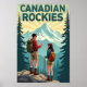 This design, titled "CANADIAN ROCKIES," functions as a retro-style travel poster that masterfully encapsulates the spirit of early 1970s adventure and the timeless allure of the Canadian wilderness. Its story is told through bold, simplified graphic elements: a stylized hiking couple confidently navigating a majestic mountain landscape, framed by towering pine trees. The dominant cool, muted color palette of greens, blues, and grays, accented by a warm, sun-drenched sky, immediately evokes a sense of nostalgia, inviting viewers to imagine themselves embracing the freedom and natural beauty of the era.