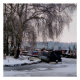 Uma cena fotográfica de neve de inverno com barcos estreitos no canal congelado.