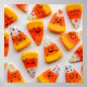 Uma linhagem alegre de milho doce com sorrisos de bobo e padrões brincalhões, desenhada num giz brilhante e estilo de marcador. Divertido, colorido e perfeito para a decoração de Halloween das crianças.