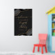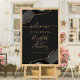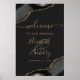 Este elegante sinal de boas-vindas de casamento vertical apresenta um design de geodo de ágata em aquarela preta com destaques de brilho dourado falso em dois cantos diagonais. A palavra "Bem-vindo" e os nomes do casal aparecem em uma fonte moderna de escrita à mão dourada sobre um grande e comercial em um fundo preto claro. Adicione a data abaixo em fonte copperplate.