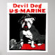 Um namorando do Corpo de Fuzileiros dos Estados Unidos, do WWI, intitulado "Devil Dog U.S. Marine". O poster que representa um Bulldog com um capacete alemão aos seus pés.