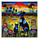 A.I. assistiu a impressão de uma cena vibrante que mostra um cão estilizado e um gato sentado juntos entre uma paisagem surreal e designs florais exagerados, quentes e coloridos vegetais, debaixo de um pôr do sol impressionante com cores ousadas e padrões geométricos.