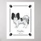 A ilustração original do desenho de Destei de um cão da raça Papillon, casaco preto e branco. O design é rodeado por bordas duplas que têm uma pata de cachorro em cada canto. Há também duas áreas de texto personalizáveis sob a imagem do cão.
