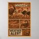 Este painel de história em quadrinhos em estilo retrô intitulado "Alerta Meteorológico" apresenta uma cena intensa de uma tempestade no deserto com animais se esforçando para sobreviver. Uma antilope e avestruzes fogem enquanto ventos fortes e detritos criam caos, enquanto um escorpião emerge da poeira. O design apresenta texto em negrito como "WHOOSH!" e um alerta de rádio dramático, capturando perfeitamente a urgência de desastres naturais. Com sua paleta granulada e tons de vermelho e layout retrô de história em quadrinhos, esta peça é ideal para fãs de histórias em quadrinhos de vida selvagem, criaturas do deserto e ilustrações dramáticas ambientais.