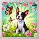Uma representação encantadora de um terrível cachorrinho boston cercado por flores florescentes, borboletas vibrantes e sol brilhante num prado vivo ao ar livre. Encorpora perfeitamente a alegria, a natureza e a magia da primavera.