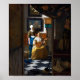 Johannes Vermeer (outubro de 1632 - dezembro de 1675), no original holandês Jan Vermeer van Delft, era um pintor holandês do período barroco que se especializava em cenas internas da vida da classe média. Durante sua vida, ele foi um pintor de gênero provincial moderadamente bem-sucedido, reconhecido em Delft e na Haia. Mesmo assim, produziu relativamente poucas pinturas e, evidentemente, não era rico, deixando sua esposa e filhos em dívida com sua morte. Vermeer trabalhava devagar e com cuidado com excelentes, e frequentemente usava pigmentos muito caros. Ele é particularmente conhecido por seu tratamento e uso intensos de luz em seu trabalho. "Quase todas as suas pinturas", escreveu Hans Koningsberger, "são aparentemente colocadas em duas salas pequenas na sua casa em Delft; mostram os mesmos móveis e decorações em vários arranjos e retratam frequentemente as mesmas pessoas, na sua maioria mulheres." Sua modesta celebridade deu lugar à obscuridade após sua morte. Mal foi mencionado no importante livro de fontes de Arnold Houbraken na pintura holandesa do século 17 (Grande Teatro de Pintores e Artistas Neerlandeses) e foi, assim, omitido de pesquisas subsequentes de arte holandesa por quase dois séculos. No século 19, Vermeer foi redescoberto por Gustav Friedrich Waagen e Théophile Thoré-Bürger, que publicaram um ensaio que lhe atribuía 66 fotos, embora hoje apenas 34 sejam universalmente atribuídas a ele. Desde então, a reputação de Vermeer cresceu, e agora é reconhecido como um dos maiores pintores da Era do Ouro holandesa. Citação: Wikipedia