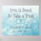 Cartaz azul com efeito bokeh e texto cinza O Amor é Doce fofo para casamento ou chá de bebê.