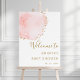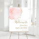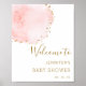 Este cartaz de boas-vindas de chás de bebê apresenta uma pétala floral pintada em aquarela em rosa blush com acentos de pontos de brilho dourado falso. Para personalização avançada deste design, clique no botão "Personalizar". Itens correspondentes também estão disponíveis.