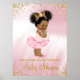 Cartaz de boas-vindas para chá de bebê da princesa afro-americana com adorável bebê negra com cabelo afro fofo usando tutu rosa e pérolas em um fundo de cetim rosa e glitter dourado. Este cartaz de boas-vindas para chá de bebê da princesa étnica é facilmente personalizado para o seu evento, basta adicionar seus detalhes. Você também pode remover o fundo de cetim e adicionar a cor de sua escolha.