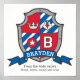Escudo estilo cavaleiros com monograma da letra B, arte do nome em pôster perfeito para o quarto ou sala de brinquedos de um menino em tons de vermelho, azul, branco e cinza. Personalize com o nome da criança e o significado do nome para um toque pessoal no quarto ou berçário da criança, este exemplo é para o nome Brayden "Do amplo vale". Amplo, bravo, inteligente e sábio. Impressão de pôster ideal como presente para um menino recém-nascido, para um batizado, nomeação de bebê ou presente de baby shower. Desenho de escudo único, arte gráfica, pesquisa de nome, texto e design por Sarah Trett. www.sarahtrett.com para www.mylittleeden.com