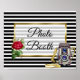 Cartaz de casamento de cabine de fotos com rosa vermelha com listras pretas e brancas e acabamento em dourado