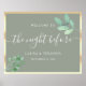 Elegante sinal de boas-vindas para jantar de ensaio em suave tom verde sage com folhas de eucalipto em aquarela e borda em dourado falso. Um design botânico refinado e moderno perfeito para dar as boas-vindas aos convidados na noite anterior ao seu casamento. Personalize com seus nomes e data.