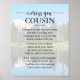 poema 'Eu sinto saudade': 'Pensei em você com amor hoje, mas isso não é nada de novo. Pensei em você ontem e nos dias anteriores também. Eu penso em você em silêncio. Muitas vezes falo seu nome. Tudo o que tenho são memórias e sua foto em uma moldura. Sua memória é meu tesouro com o qual nunca vou me separar. Deus tem você em sua guarda, eu tenho você no meu coração.' Perfeito para lembrar um primo querido.