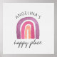 Transforme o quarto do seu filho no seu lugar feliz pessoal com este design minimalista, mas colorido de arco-íris em um fundo de textura de papel aquarela. Basta personalizar com o nome da criança para um toque pessoal. O design original aquarela apresenta um arco-íris roxo e rosa centralizado com texto.