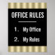Cartaz humorístico preto e dourado "Regras do Escritório". Você pode personalizar este cartaz engraçado alterando a cor do fundo e adicionando seu texto para fazer dizer o que quiser. Fica ótimo com uma moldura preta!