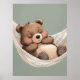 Tão aconchegante quanto possível. Este cartaz tranquilo apresenta um urso adormecido adorável enrolado em uma rede, cercado por tons de sage suave e sombreamento doce e gentil. Perfeito para quartos de bebês, quartos de crianças ou qualquer lugar que precise de um pouco de calma.