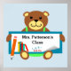 Personalize este cartaz personalizado de sala de aula de um ursinho de pelúcia segurando uma faixa branca com o nome do professor e lápis e livros em primeiro plano. Vai alegrar qualquer aula da escola primária. A cor do fundo também pode ser alterada.