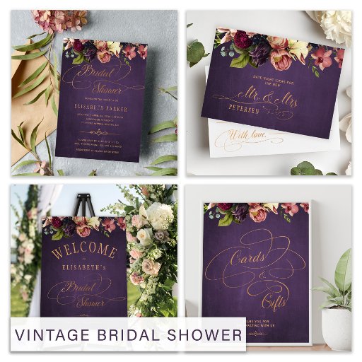 Lúxio elegante roxo escuro plum clássico faux gold metal calliografia em cobre script chá de panela cartões de boas-vindas e sinal de presentes com uma terra de flores rosa-safra, plum indigo e creme de marfim. ++++++++++++++ Adequado para festas noivas românticas, elegantes e elegantes, de Verão, outono ou noivas de inverno.