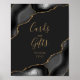 Um sinal chique e elegante para agradecer aos convidados do casamento na mesa de Cartões e Presentes. As palavras "Cartões" e "Presentes" aparecem em caligrafia dourada, com "obrigado!" abaixo em fonte serifada. Desenhos de ágata em aquarela preta com brilho dourado falso enquadram a mensagem em dois cantos sobre um fundo preto-baço. Veja nossa coleção para conjunto de convite de casamento e papelaria do dia.