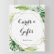 Este cartão de destino geométrico e sinal de presentes é perfeito para um casamento tropical ou chá de noiva. O design apresenta folhas de palmeira e banana verdes pintadas à mão em aquarela, dispostas de forma organizada em lindos buquês, adornando uma moldura geométrica dourada.