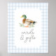 Mostre aos amigos e à família onde deixar suas cartas e presentes no seu chá de fraldas, elegante e azul, medidor de patos gingham.