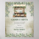 Belo design de poster de "Cartões e Presentes" de Feira de Agricultores com eucalipto verde-selva e boutique. O fundo envelhecido rústico combinado com o suporte de madeira carregado de verde e o eucalipto suspenso circundante lembra uma feira ao ar livre italiana ou rural.